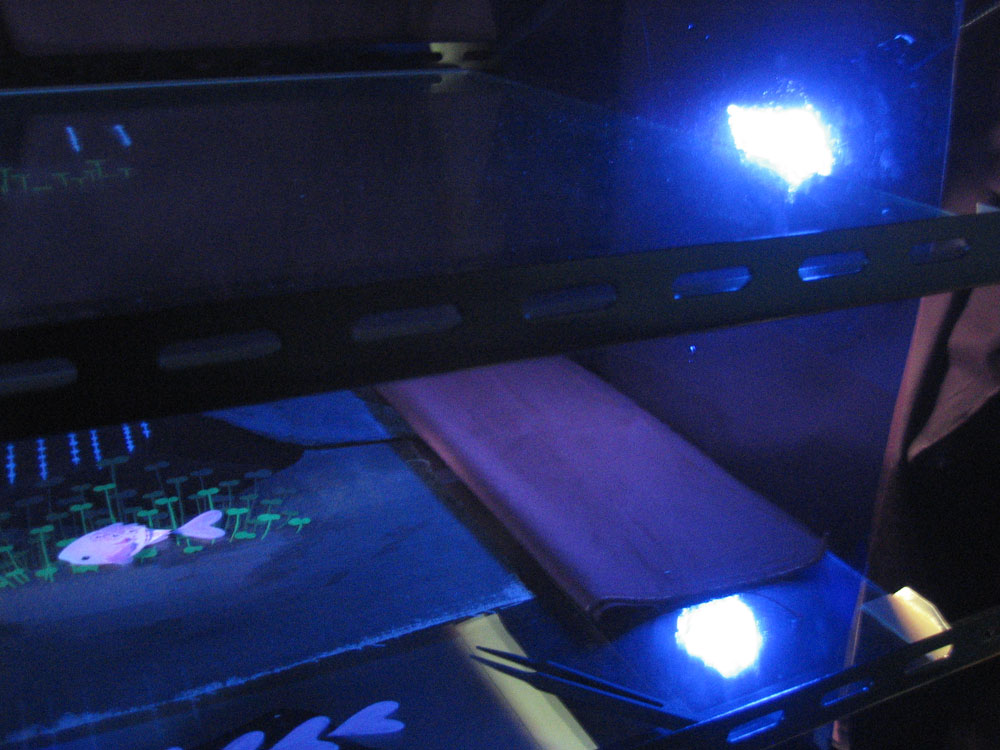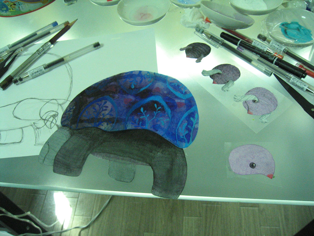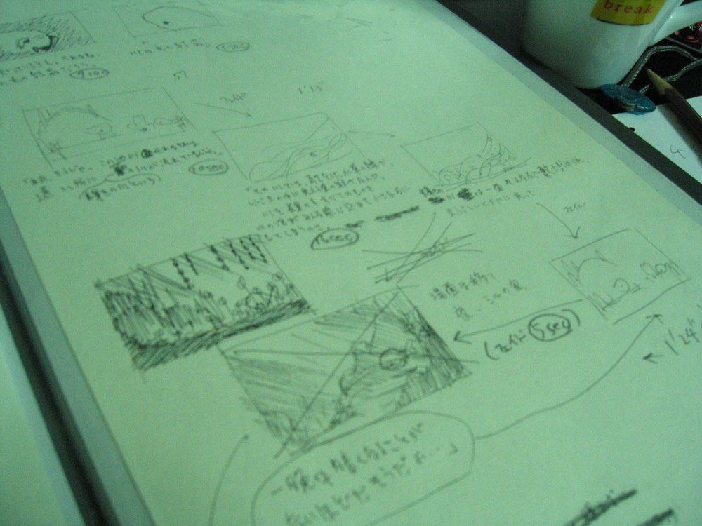 作品で使用した撮影台は6枚のガラスで層が作られています。シーンによっては各層の高さを調整したりもします。キャラクターや背景はセルや紙にアクリル絵の具で描き切り抜きます。明るい色は上下のガラスに何重にも映り込んでしまうので、裏面は黒く塗ってそれを防ぎます。また布を素材として使ってみたりもしました。蝶のシーンは半透明の絵の具で描かれ下から光を当てスクリーン上に投影するという影絵の手法を用いています。カワネズミのシーンではスパンコールやラインストーンに光を反射させ、1コマごとに光源を移動させることでキラキラと光らせました。