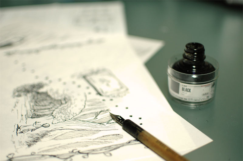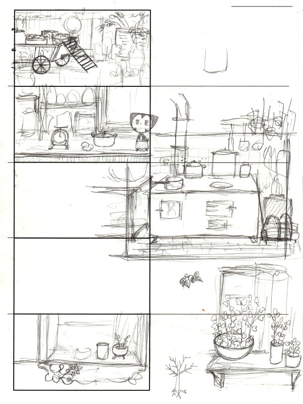 今作はイラストと切り絵アニメーションという2つのスタイルで構成されています。イラストはインクとペンを画材として使用しました。本の挿絵をイメージした絵で画面中にテキストや楽譜をヴィジュアル要素としてレイアウトするといった試みもしています。アニメーションは「輝きの川」と同一の手法ですが、ほぼ毎カット背景が変るようなレイアウトで、必要となった素材の量は「輝きの川」の比ではありません。その分作品世界がより広く描かれました。素材の描き方も「輝きの川」ではアクリル絵の具でしたが、「ちいさな灯り」ではセルに下自在を塗り、インクペンで描画、透明水彩で着色となっています。
